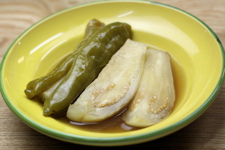 ごま油で白なすと万願寺とうがらしをさっと炒めて、水を加えてなすが柔らかくなるまで煮ます。